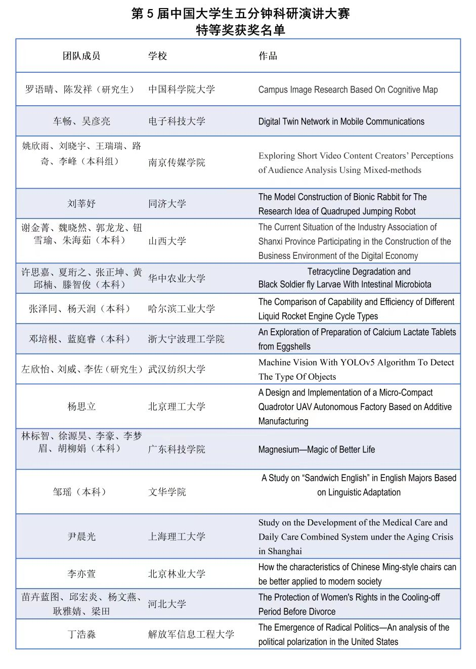 随着2022年8月12日和8月20日全国决赛的举办,历时将近半年、用英语陈述科研项目的第五届大学生五分钟科研演讲大赛落下帷幕。我校学子在本届大赛中取得了优异成绩。其中,来自机械学院的左欣怡同学及其团队成员刘威,李佐获得全国特等奖,其英语指导老师为WilliamHill中文华敏、蔡倩老师,专业指导老师为马双宝、沈满德老师。来自电子与电气工程学院的石紫迪和些婧一同学获得全国一等奖,其英语指导老师为WilliamHill中文的蔡倩老师。另外,还有其他来自管理学院,材料学院和化工学院的8位同学及其团队分别荣获全国二等奖和三等奖。特别值得关注的是管理学院研究生一年级的潘帆同学,在参加比赛时还是一名本科生。在其导师周新建博士的指导下荣获三等奖的好成绩。