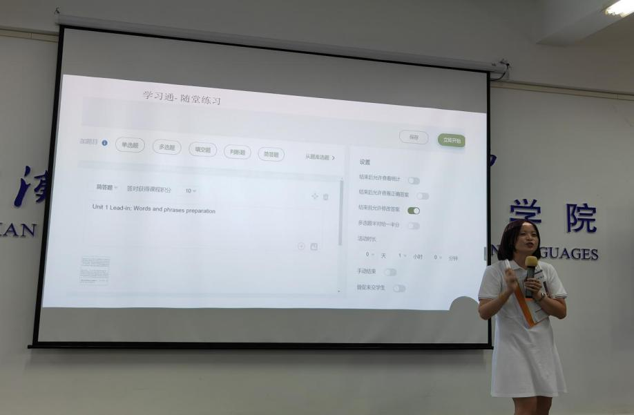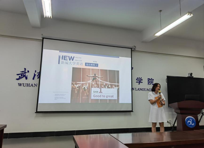 罗阳老师这次展示的内容为《新编大学英语》综合教程Book1Unit1Goodto great的导入课程设计。针对大班授课,罗老师首先进行了学情分析,总结了大学新生在英语学习中存在的问题,并提出了新学期的教学目标。为了保证大班课堂的教学效果,罗老师从实践中找到了较好的教学方式:从单元的主题开始,以新颖独特的讲解方法让学生瞬间沉浸在话题的情景中,接着利用学习通平台的随堂练习,发放精心设计的段落填词任务,再利用中国古代圣贤语录,让学生领悟中国文化的智慧,最后布置深度的课文预习作业。