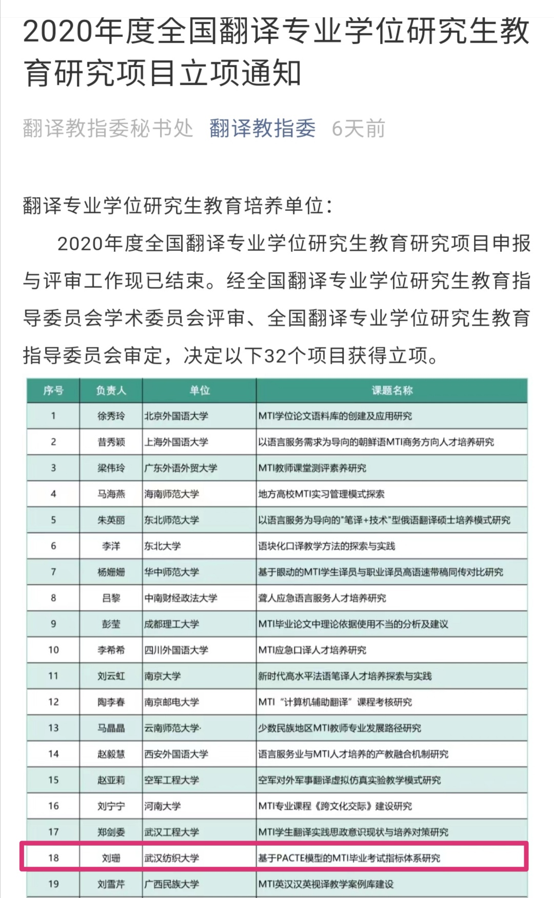 此次经全国翻译专业学位研究生教育指导委员会学术委员会评审、全国翻译专业学位研究生教育指导委员会审定立项32个。刘珊老师项目的立项,是我校翻译硕士学位点建设的新突破,将进一步推动我校翻译专业学位研究生教育的发展和培养质量的提升。