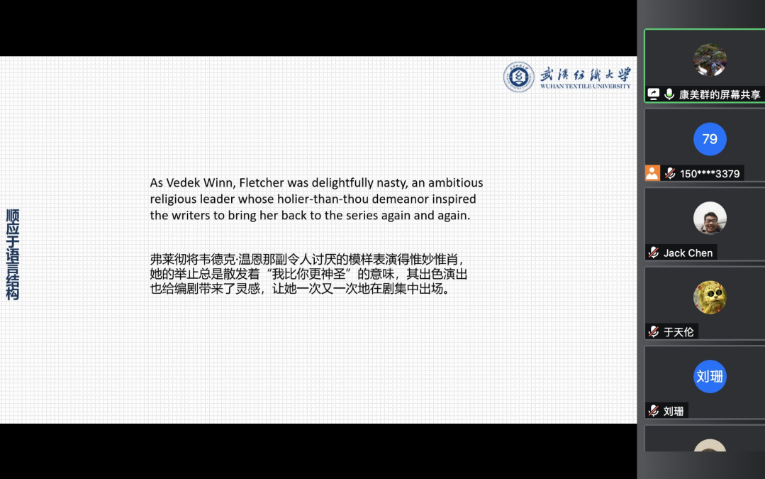 康美群同学分享的主题是“语用顺应论指导下的翻译实践及《Catch-22》读书分享”,内容大致分为三个部分。在第一部分,康美群同学就本次翻译实践的理论做了简要介绍;第二部分,具体分析了翻译理论如何指导自己的翻译实践;第三部分,结合《Catch-22》具体的例子介绍小说语言特点,并分享读书感悟。