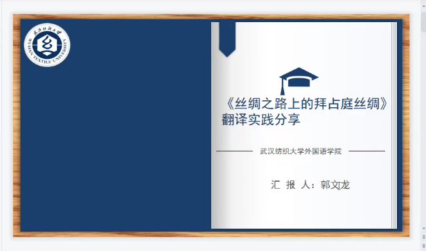 随后,刘方荣副院长表示《丝绸之路上的拜占庭丝绸》这本书颇有难度,表扬了郭文龙挑战自我的勇气。同学们要运用多种手段查阅相关文化知识和术语背后的知识。翻译是一项枯燥但也有趣的活动,熬过艰辛的过程才会有喜人的丰收。