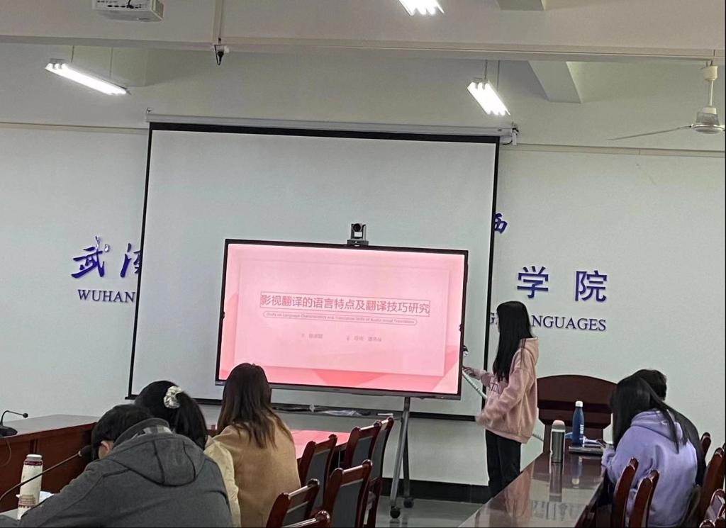 第三位汇报人杨淑颖的主题是影视翻译的语言特点及翻译技巧研究。她的分享分为四个部分:研究目的、影视台词的特点、案例分析、影视翻译技巧总结。首先她简要概述了德国语言学家汉斯•弗米尔的翻译目的论,目的性、连贯性、忠实性三大原则并具体解析说明。她指出影视作品翻译作为现今语言文化传播的重要桥梁之一,影视翻译具有非常重要的研究价值。她总结出影视翻译具有调动性、瞬时性、简洁性三大特点,并详细分析解释。随后她以三大原则为划分,结合具体的影视翻译台词为例进行分享讨论。最后,她总结出影视翻译中要注意的五大点:1.根据文化因素采用相应的翻译方法;2.弄清角色的性格特征,使翻译文本更贴合人物形象;3.注意影视的受众和类型,采取不同的翻译风格;4.根据不同的语境适当增减语言内容,保持影视画面的和谐;5.不断探索和应用各种个样的影视翻译技巧。