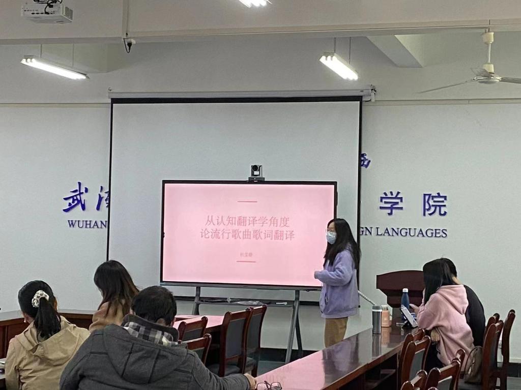 第二位汇报人杜雯静的主题是从认知翻译学角度讨论流行歌曲歌词翻译。她的分享分为四个部分:认知翻译学、流行歌曲歌词特色、歌词翻译举例、歌词翻译存在问题及解决办法。她首先为大家简要介绍了认知翻译学的翻译和发展情况,又重点介绍了认知翻译学中的重点翻译原则:认知对等原则、多重互动原则、创作性原则、体验型原则等等。然后她总结出流行歌曲中歌词的四大特点:语言通俗易懂,具有亲切感,注重与现实生活相结合,歌词与时俱进,使用意象寄托情感,并结合认知翻译的具体翻译原则对周杰伦歌曲《晴天》的歌词举例进行具体分析。最后她以美国民谣Five Hundred Miles和泰勒斯威夫特歌曲为例分析英文歌词汉译过程中容易出现的问题,并提出相应的解决办法和自己的译文。她认为根据认知翻译学理论下的翻译原则,歌词翻译需要译者与作词者最大程度上实现认知对等,体验作曲者的情感,合理利用主观能动的影响在原文上进行创作。