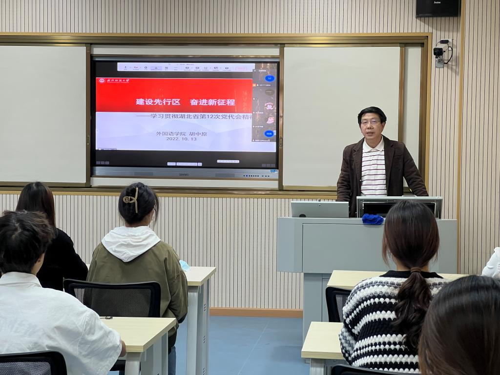 为进一步学习贯彻湖北省第十二次党代会精神,提高同学们的政治思想,10月13日下午2点在崇文楼206B开展湖北省第十二次党代会精神宣讲活动,本次活动由WilliamHill中文党委书记胡中原主讲,各班班长及团支书在线下参会,其他同学在线上参会。