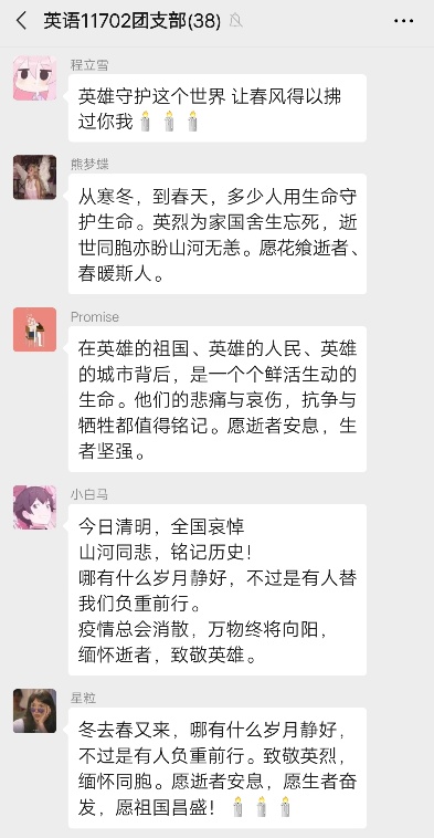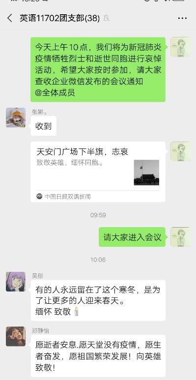 英语11702班则在微信群举行了向新冠肺炎疫情牺牲烈士和逝世同胞哀悼活动。9时58分,支部成员通过线上会议的方式出席活动,神情凝重,默然肃立。10时整,防空警报声、汽车鸣笛声响彻城市上空,大家在全国各地,向新冠肺炎疫情牺牲烈士和逝世同胞默哀3分钟。最后,分别分享自己的活动感想。有同学这样说:“2020年的清明节,与往年不太一样,交织着冷暖与悲欢,承载着压抑与焦虑,融合了感悟与思考。 谢谢白衣战士、公安干警、社区工作者……愿所有逝去的同胞安息,他们没有离去,只是换了个地方活在我们心里。致敬生命,缅怀英烈,礼赞英雄!”