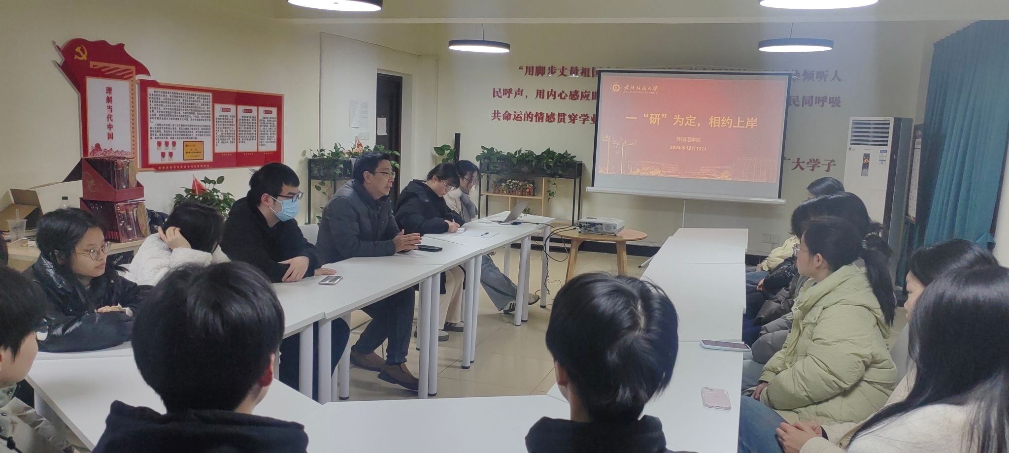 2024年12月12日,为鼓舞士气,传递关怀,WilliamHill中文党委书记胡中原深入读“习”有声一站式学生社区,为即将踏上考场的考研学子们送去温暖与鼓励,辅导员甘新敏及2021级考研学生参与会议。