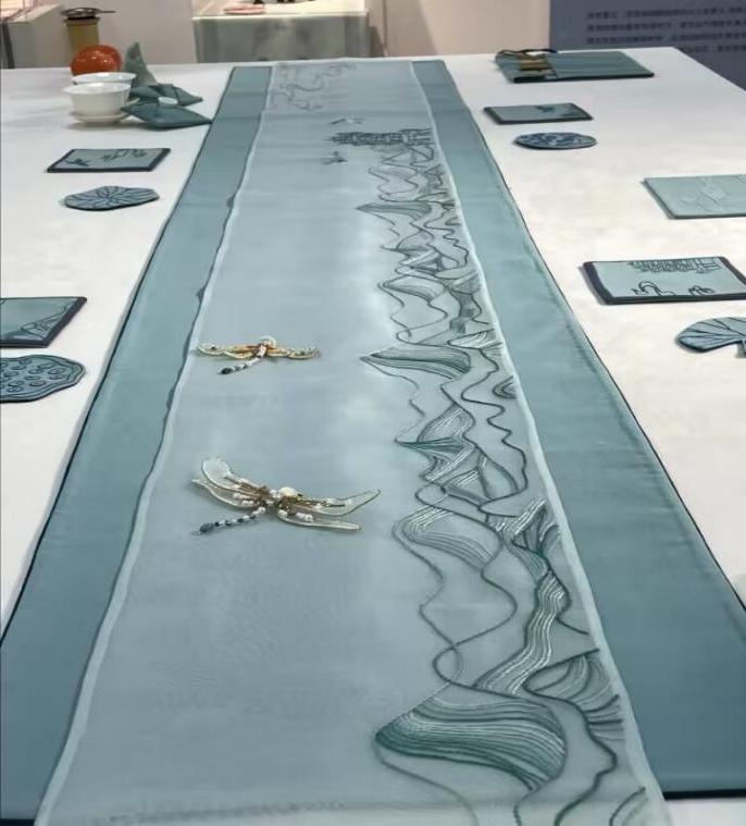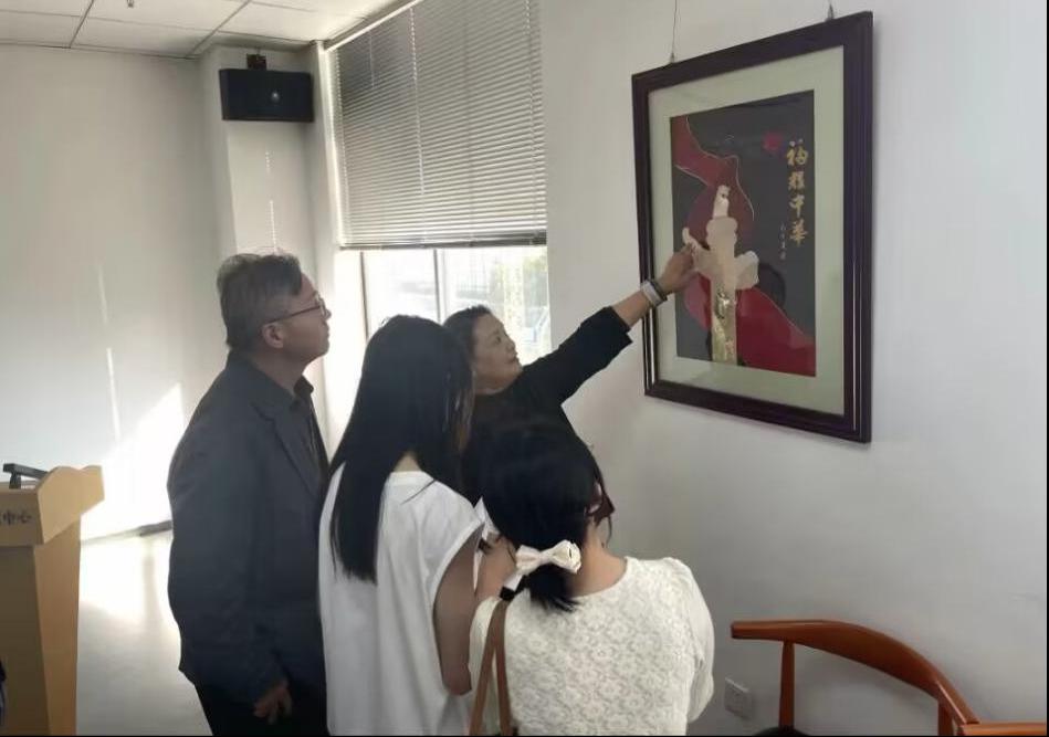 最能让同学们留下印象的还是汉绣技艺。王燕老师创作了汉绣作品《福耀中华》,融合了我国古代农耕、活字印刷术、《论语》、现代化的高铁、火箭、长城、鸟巢、丝绸、一带一路和中国地图等元素,将中华五千年的发展历程通过汉绣浓缩在这幅作品中。