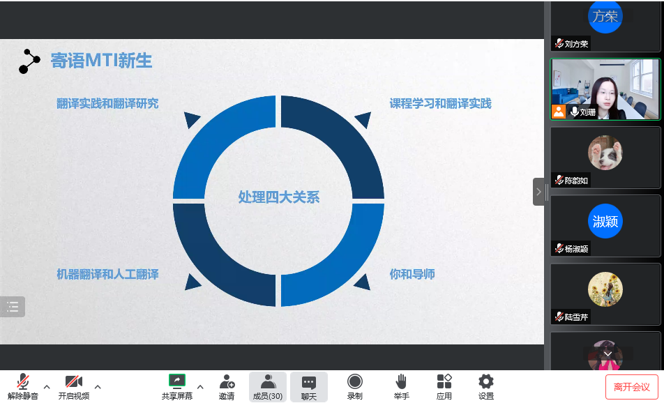 最后,刘院长对会议中的重点内容进行了补充与强调,并对此次会议进行总结。她向同学们提出殷切的希望,并祝愿大家学有所成。至此,2022级MTI新生入学教育会圆满结束。