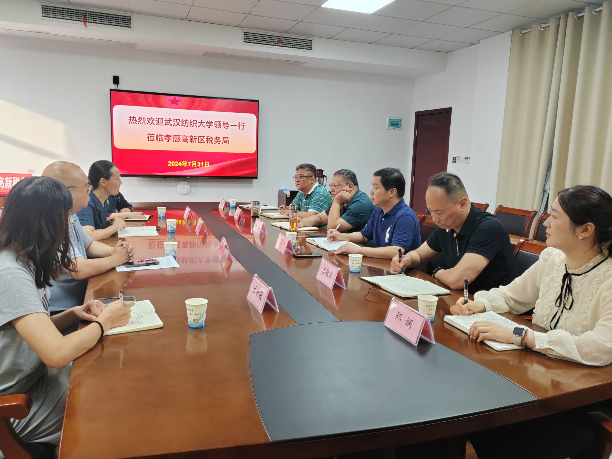 在孝感市高新区税务局,金艳一行看望了马克思主义学院2023届毕业生郑娴,与高新区税务局相关领导展开会谈,围绕高新区干部培养制度、深化校地合作,推动高层次人才输送等方面深入交流。高新区税务局党委书记、局长姚昆对郑娴的工作能力和表现给予充分肯定,对学校输送的优秀人才表示感谢,并强调院校在人才培养中应坚持以德为先、德才兼备的标准,为学生提供更多实习实践的机会与平台。金艳介绍了近年来学校学科发展、人才培养、就业创业等方面的办学特色和发展情况,对高新区税务局领导、同事对校友的接续培养和认可表示感谢,并鼓励郑娴要做到“心中有信仰、人生有目标、眼中有工作、未来有成绩”。