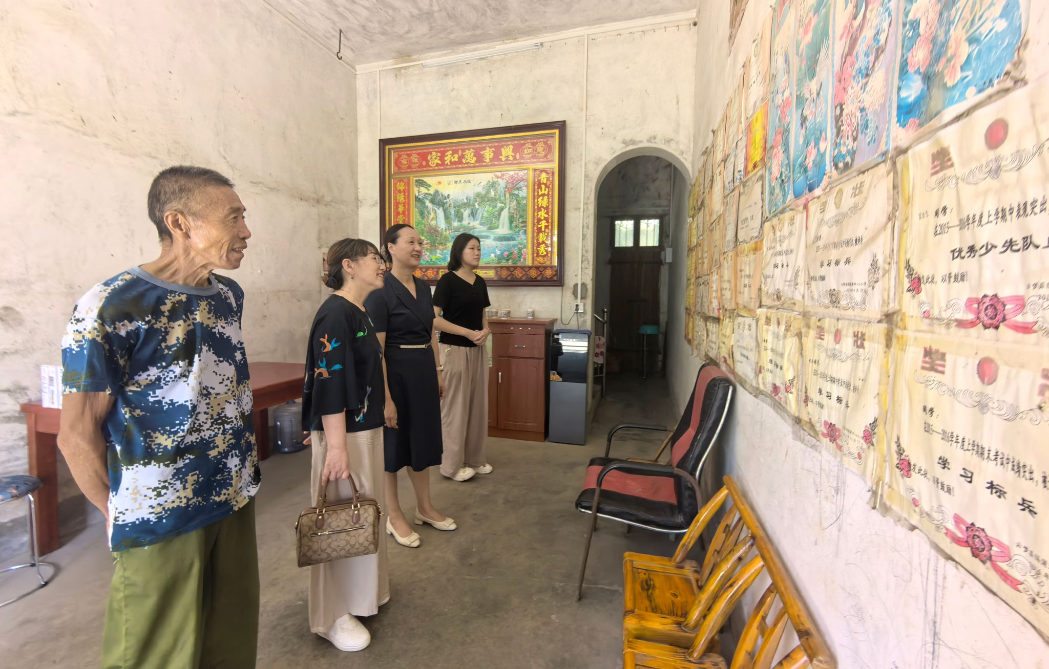 在云梦县袁西村商务英语12201班袁思莹的家中,映入眼帘的是厅房满墙的奖状。袁思莹主动向老师们介绍着自己这些荣誉背后的故事。老师们对袁思莹成长道路上付出的努力表示肯定,鼓励她要坚持梦想,脚踏实地,一步一个脚印完成阶段性目标,通过自己不懈努力实现梦想的青春是最美丽的。