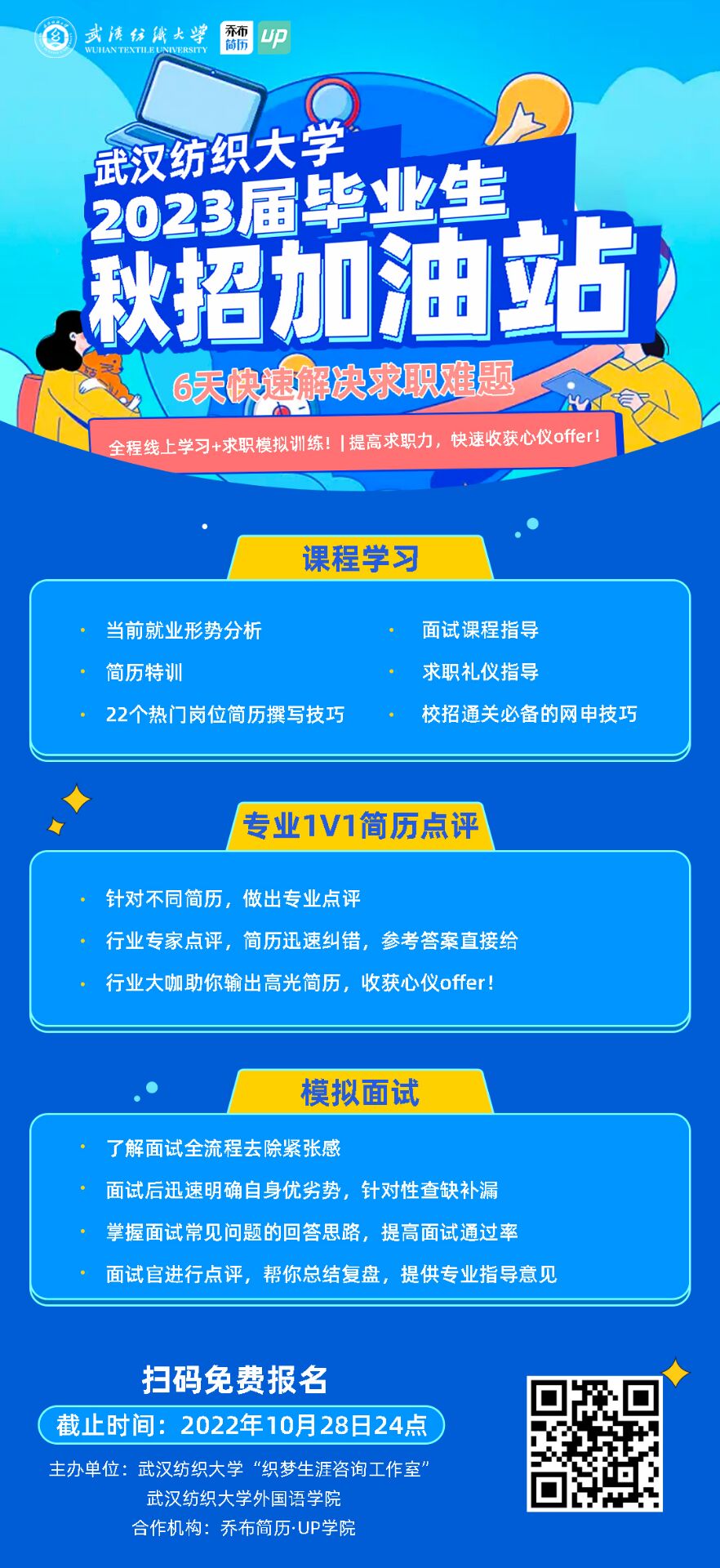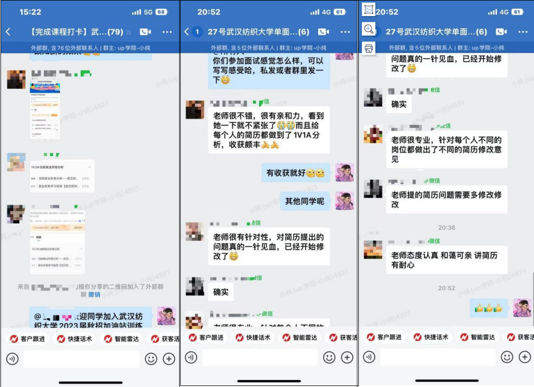 10月25日,秋招加油站活动正式开营,此次秋招加油站活动为期一周,课程内容包括就业形势分析、简历特训、18个热门岗位简历撰写技巧、面试技巧分享、热门行业面试技巧、求职礼仪指导、网申必备技巧、专业简历1v1点评、群面模拟、单面模拟等。同学们通过学习就业形势,简历课程、面试课程、求职礼仪,网申技巧等5大模块课程,不断提高对职业的认知和求职能力。专家针对简历求职意向、岗位硬实力、内容结构等方面点评,增强了简历的针对性和亮点。群面模拟、单面模拟课程,采用无领导小组讨论、模拟面试等形式,实战面试真题,同学们认真讨论,积极发表自己的观点与看法,打开思维,体验单面和群面过程,通过模拟实战提升了面试技能。