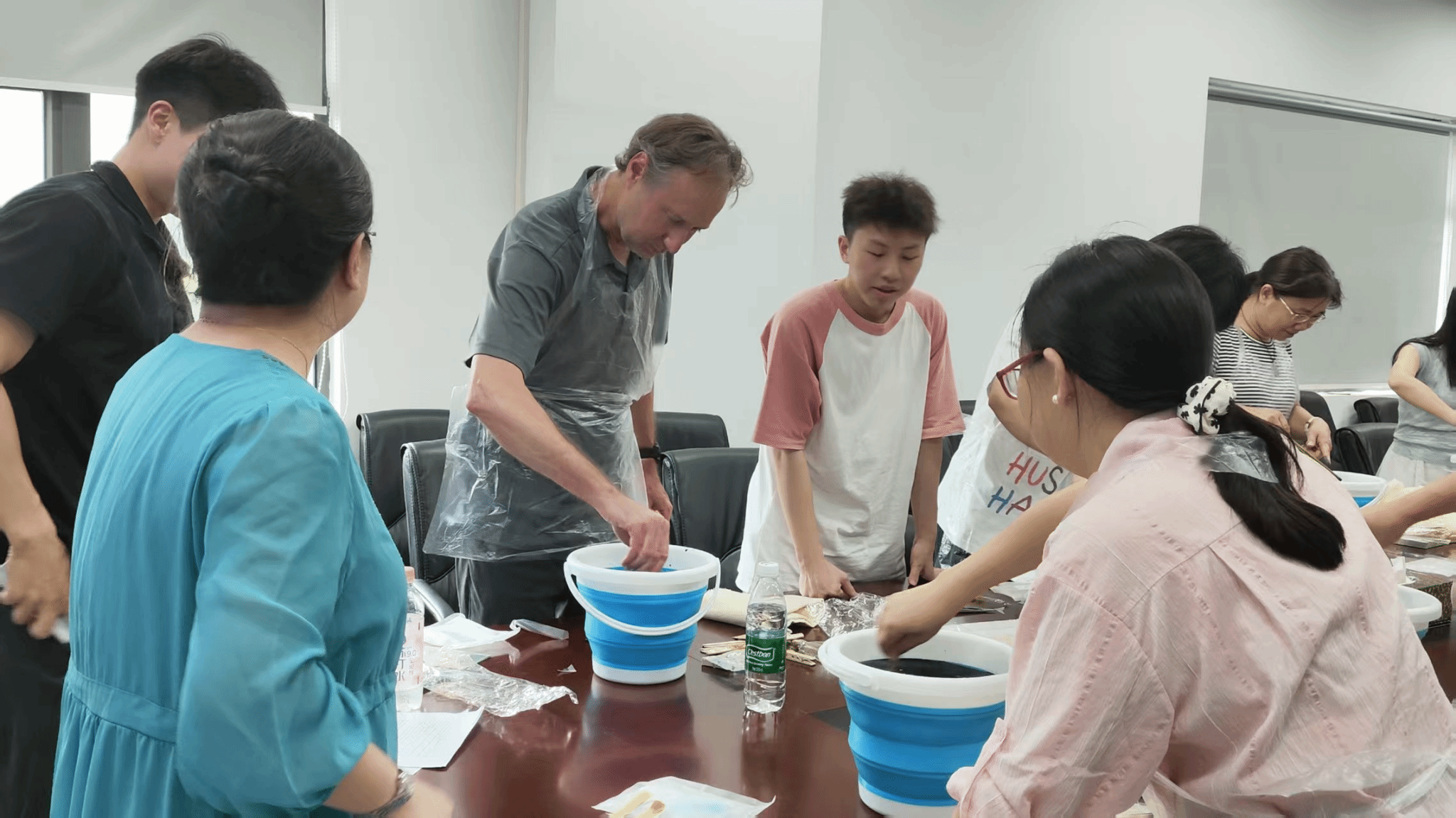 实践环节,Wolter教授与师生在王妮团队指导下,亲手体验千年绞缬技艺。从棉质围巾的扎花定型,到手扎捆扎的纹路创作,再到浸入靛蓝染缸的三分钟染色、反复氧化固色,最终拆解出冰裂纹理的瞬间引发阵阵惊叹。“That’s amazing!”Wolter教授轻抚渐变蓝纹感叹。这是他第一次亲身体验中国非物质文化遗产的制造过程。这正印证着"纺大染语"的品牌理念,以古法手绘让色彩在布帛起舞,让两千年的荆楚智慧化作传统与现代交融的文化使者。