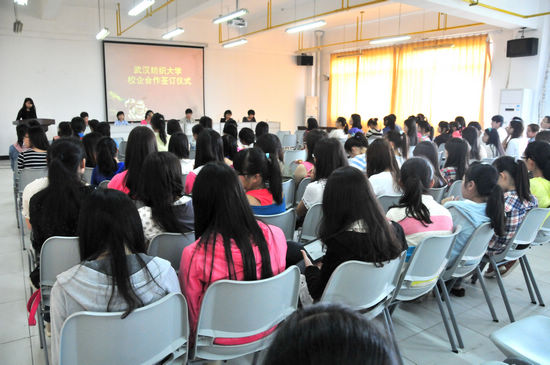 2013年,外语学院代表学校与北京外企国际商务服务有限公司(FESCO)合作共建首个大学生海外实践教育基地,为探索英语专业应用型人才培养模式改革、建立海外文化实践专门化途径搭建一个全新的平台。5月16日下午,此项合作协议签约及揭牌仪式在阳光校区大活305会议厅举行,北京外企国际商务服务有限公司的项目总监闫昕、项目办主任张梓萍、湖北省教育厅对外交流处主任陈丽华,学校团委副书记刘欣,外语学院院长何畏、党委书记陈国新,学院辅导员及100余名外语学子参与了签约仪式。外语学院副书记卫冬妹主持了仪式。