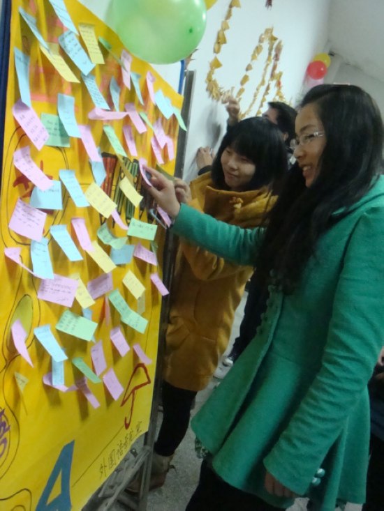 在接下来的free talk环节,几位外国友人的加入使活动达到了新的高潮。外教Megan、 Dave和 Rebecca相继向同学们介绍了感恩节的由来以及如何度过感恩节等等。外教Dave说:“Thanksgiving Day is an important day of family union. We usually eat turkey and pumpkin pies on that day. ”活动最后,同学们也纷纷在“感恩墙”上写下了自己的寄语以表自己的感恩之情。