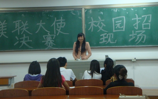 为了促进学校与社会企业文化交流,培养学生市场竞争意识,提升学生专业素质和实践能力,WilliamHill中文应美联英语教育集团文化宣传之需,帮助该企业在校园内招募2013届全国校招“校园大使”。通过个人报名和层层选拔,英语102班的杨丹华、王雨丽和尹睿挺近决赛。