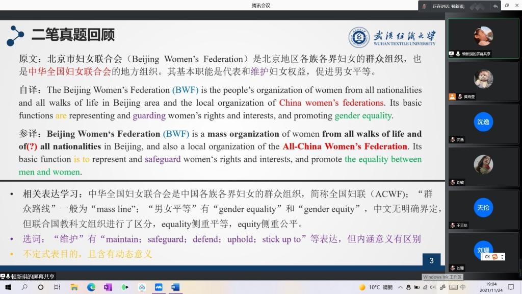 顿新琪同学分享的主题是“二笔真题回顾及《如何撰写翻译实践报告》读书分享”,内容分为两部分。在第一部分,顿新琪同学就21年11月的CATTI真题---汉英的第一篇进行了回忆,并将其译文与参考译文进行了对比分析和总结。第二部分,顿新琪同学就自己的经验,详细为大家阐述了翻译实践报告的写作的基本模式:项目介绍、理论框架和案例分析这三个板块。最后,顿新琪同学向大家推荐了《如何撰写翻译实践报告》这本书,她指出作者李长栓教授提出的CEA翻译描述框架值得大家去了解学习。
