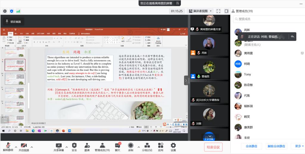 两位同学的分享结束后,曹福然博士作了点评。对于韩笑同学的分享,曹福然博士认为她分享的内容逻辑清晰,理论视角创新,但是对于高低语境的区别表述不够清晰,还有提升的空间。陈奇敏老师认为韩笑同学的分享层次清晰,有一定的理论深度,同时也给韩笑同学提出了一些建议,例如韩笑同学有些地方的翻译选词不够恰当。对于黄雨萱同学的分享,曹博士认为她的PPT制作精良,由浅入深的讲解值得称赞,并对黄雨萱同学提出的翻译相关问题给出了解答。陈奇敏老师肯定了黄雨萱同学能灵活利用网络资源学习,但是也指出在翻译实践时需要考虑到读者群,针对不同类型的读者选择合适的译文。
