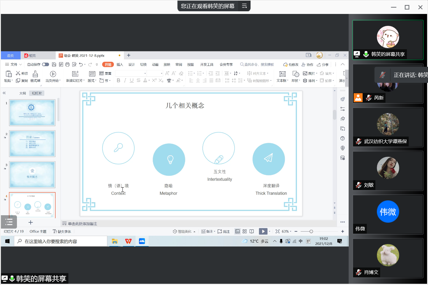 12月8日19:00-21:00,WilliamHill中文在线上成功举办了第二十九期“经纬译学”研究生论坛。本次论坛由曹福然博士担任教师主持,21级MTI研究生呙新担任学生主持,20级MTI研究生韩笑和21级MTI研究生黄雨萱主讲。WilliamHill中文院长谭燕保教授,MTI教育中心主任刘珊副教授、陈奇敏副教授、赵伟副教授以及全体MTI研究生参与了此次研讨会。