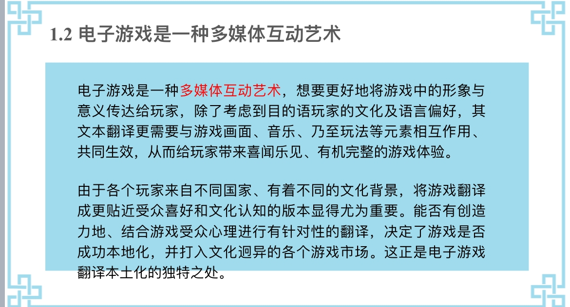 陈家乐以“从傅雷‘神似论’角度探讨游戏文本翻译的四字格用法”为题,从游戏翻译简介、神似论与四字格、案例与分析三个方面进行展示介绍。为了更好地引进优秀游戏,如何将海量英文游戏本地化为汉语成为时代的挑战,由于各个玩家来自不同国家、有着不同的文化背景,将游戏翻译成更贴近受众喜好和文化认知的版本显得尤为重要。能否有创造力地、结合游戏受众心理进行有针对性的翻译,决定了游戏是否成功本地化,并打入文化迥异的各个游戏市场,这也正是电子游戏翻译本土化的独特之处。第二部分则结合傅雷神似论的相关内容:电子游戏文本翻译在许多类型的文本上都会有四字格的运用,四字格在表意上不仅蕴含着深刻道理,还可生地动还原游戏所想传达的画面感,能有效传递游戏文本想表达的神韵之美(丰富内涵),此外四字格还有四字的基本格律,可谓神形兼备,这正与神似论在古典文学美上所追求的神形统一有着异曲同工之妙。最后结合具体案例进行总结,四字格虽然用起来精炼老道,但很多时候由于字数固定,表达空间狭小,过分拘泥于原文很可能陷入词穷的境地。但在游戏翻译中还有另一种选择,那就是重神丢形,大胆创译的“神似”,在确保译文在表意或目的上与原文接近的前提下,只要在能令译文出彩,适当地“背叛”原文无可厚非。