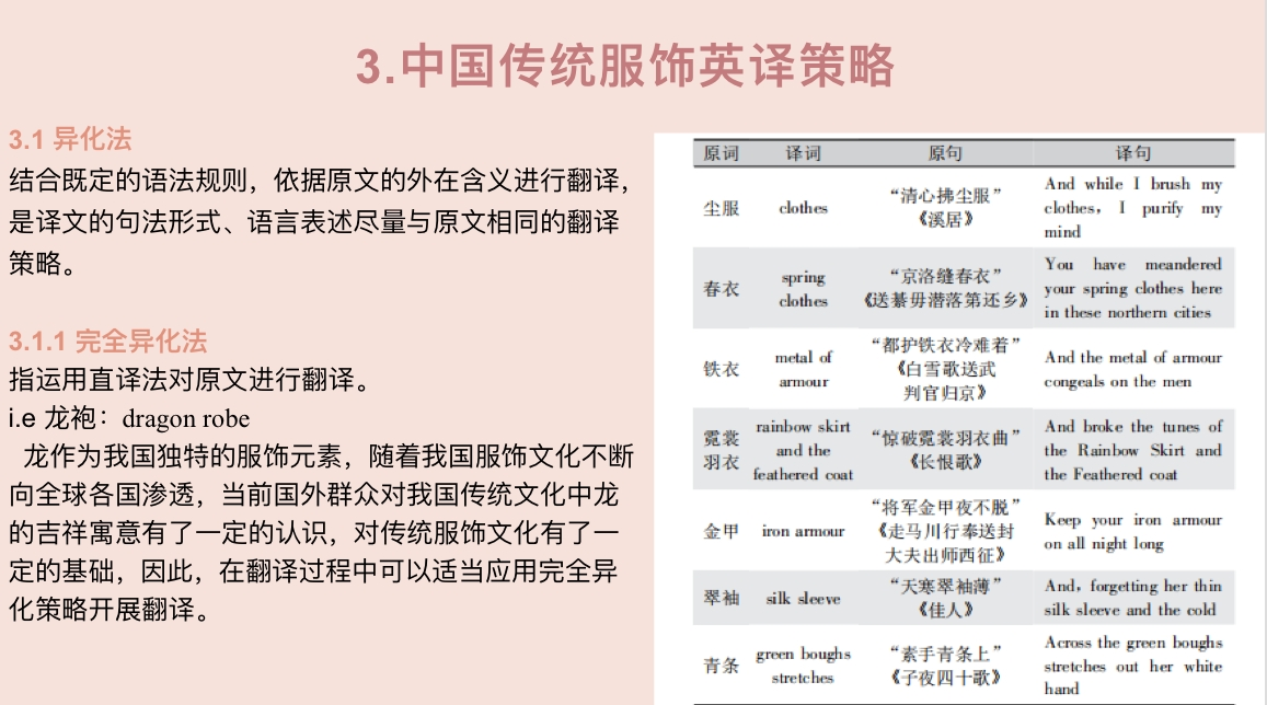 会议伊始,谢畅分享视频介绍了中国传统服饰相关情况,并以“中国传统服饰命名特点及英译研究”为主题,围绕中国传统服饰翻译现状和问题,中国传统服饰命名特点,中国传统服饰英译策略这三个方面详细具体展开汇报。她首先指出当前情况下存在的词汇空缺问题,然后从物质文化的可译性限度和习俗文化的可译性限度分别阐述,一针见血地指出了问题所在;第二部分则介绍了在中国传统服饰中,会根据颜色、服饰面料材质、图案纹样、服饰款式和尊卑等级这几种情况进行命名,涉猎比较广泛,查阅资料繁多,准备比较充分,并结合具体资料和图片进行展示。最后一部分则全面表现了中国传统服饰的英译策略,有异化法(包括完全异化法和异化注释法)、音译法(包括完全音译法和音译直译法)、意译法和省译法多种翻译方法,并通过红楼梦中的具体案例相结合进行分析比较。