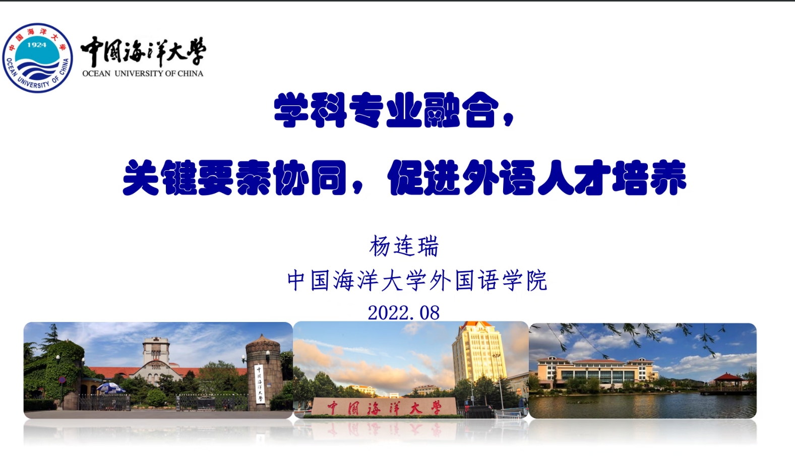 新学期伊始,WilliamHill中文开展了本学期第一场学术活动。8月30日晚上7点,中国海洋大学WilliamHill中文院长﹑博士生导师杨连瑞教授应邀在云端作了题为“融合学科专业,协同关键要素,促进外语人才培养”的学术讲座。此次讲座是WilliamHill中文学科专业融合系列论坛的首场,讲座由院长谭燕保教授主持,WilliamHill中文全体教师在线参加了此次讲座。
