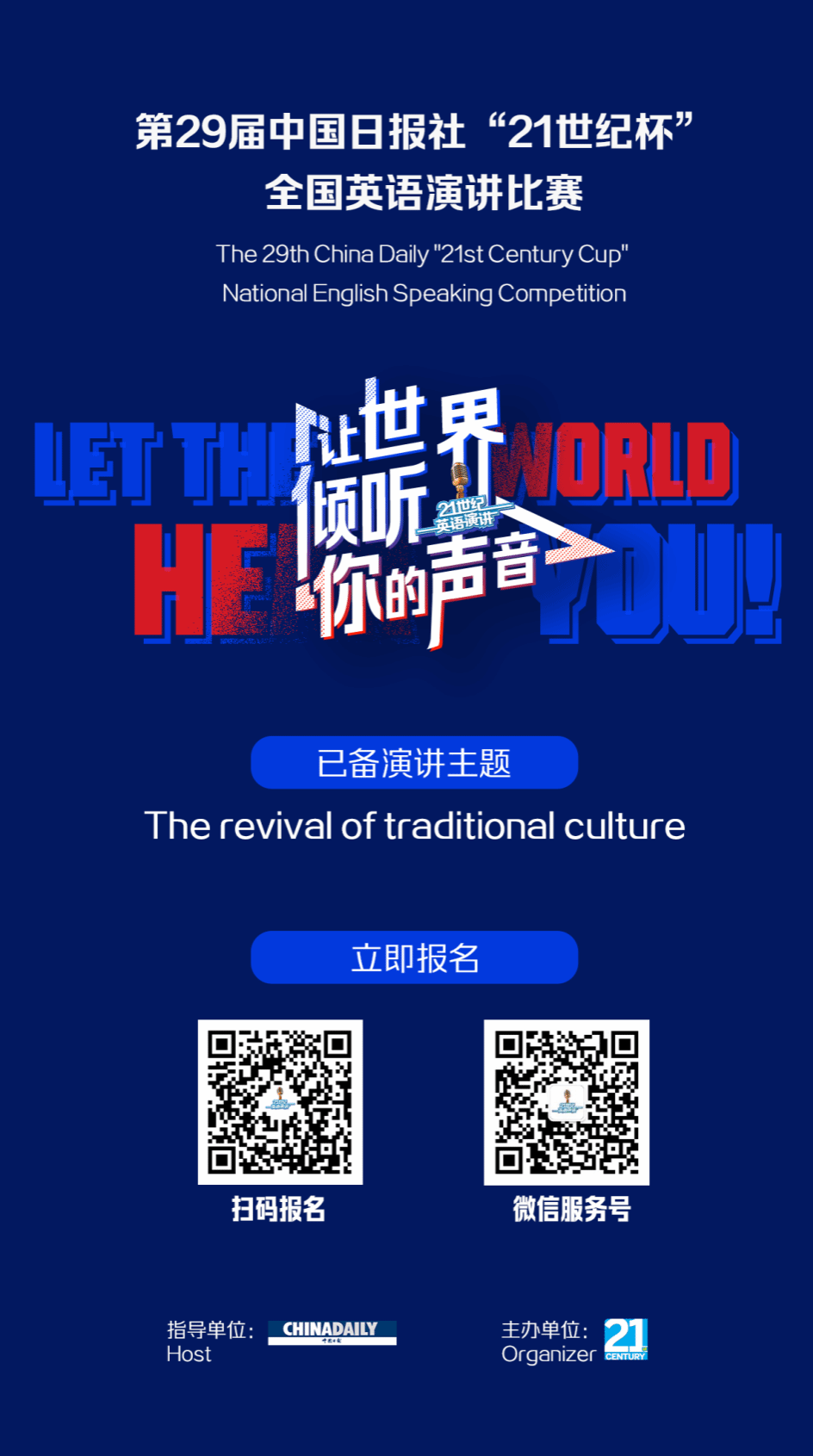 “21 世纪杯”全国英语演讲比赛高举习近平新时代中国特色社会主义思想伟大旗帜,全面贯彻落实党的二十大精神,为提高中国青年讲好中国故事的能力水平,为加强我国国际传播能力建设、促进文明交流互鉴、推动构建人类命运共同体凝聚青春力量。自 1996 年创办以来,大赛作为每年 5 月在英国伦敦举行的国际公众演讲比赛(IPSC)的中国区官方唯一选拔赛,表现优异者将代表中国在国际舞台上展示中国青年学子的风貌。
