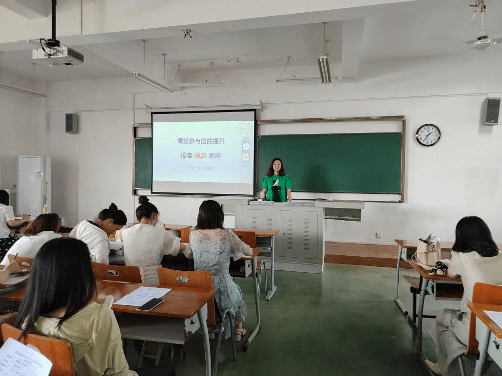 刘老师以“课堂参与度的提升——语言、思政、思辨”为题,从语言知识、思辨能力和思政素养三个方面分享和介绍了她近两学期在超星泛雅平台进行混合式教学实践的体验。
