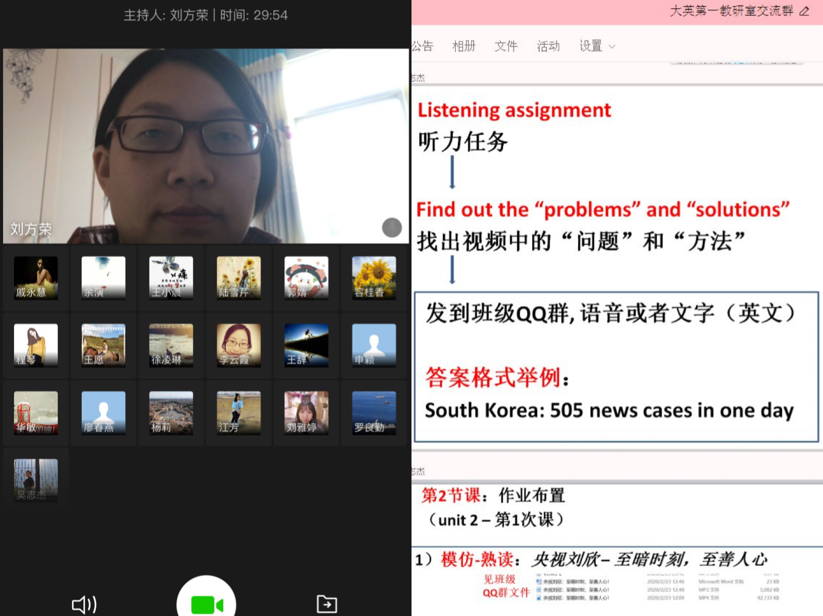 教师们课程思政融入到英语教学当中,引导学生关注国家大事,了解国家政策,增强民族自豪感和使命感,号召学生努力学习知识,为国家的发展贡献自己的力量。3月5日,大学英语第一教学部教学探讨会上,吴志杰老师就如何将新冠疫情融入到课堂教学中做了主题分享。她在讲解problem-solution skill这个听力技巧时,首先给学生输入中国外文局所审定的新型冠状病毒肺炎疫情相关词汇英文表达,然后给学生播放一段标题为“Clusters grappling with the spread of the coronavirus”英语新闻视频,引导学生从该新闻中找出problems“问题”和solutions“方法”,并在QQ群里以语音或者文字的方式分享答案,另外把主持人刘欣的《至暗时刻,至善人心》的英文演讲视频分享给学生,让学生课后熟读模仿并把语音传到QQ作业上。