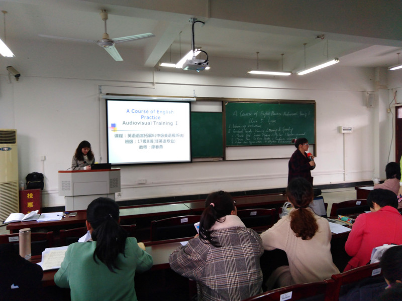 廖春燕老师以大学英语语言拓展课程---中级英语视听说教程为例,先后介绍了教材选择、教学方法运用、“雨课堂”平台准备与学生分组情况、教学目标设定与教学步骤。