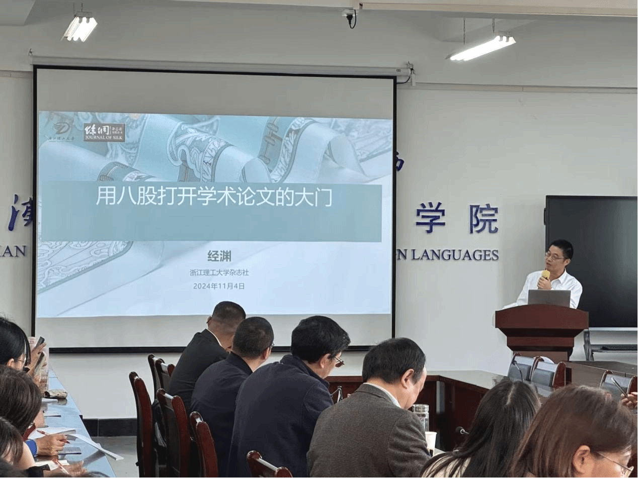杨一舟的讲座题目是“丝绸之美 美美与共”期刊学术论文写作与选题—以《丝绸》为例。《丝绸》期刊由浙江理工大学、中国丝绸协会、中国纺织信息中心共同主办,是国际丝绸联盟、中国丝绸协会、浙江省纺织工程学会的会刊。该期刊连续多次被评为“中国高校优秀/百佳科技期刊”,并在2021年荣获中国出版政府奖期刊提名奖,2023年入选中国科学院CSCD数据库(核心库)、全国中文核心期刊、中国科技核心期刊。她介绍了《丝绸》的办刊理念:固化于制、外化于行、内化于心、实化于践。杨一舟表示,2025年,《丝绸》将聚焦数智时尚,打造学术高地,积极营造学术氛围,构建学科交叉融合平台,发表纺织领域基础研究、技术创新、设计理论和文化传承等方面的学术论文。