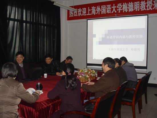 梅德明教授以“两篇小学生作文的思考”为引子,首先分析了当今英语专业面临的问题和挑战。随后,梅教授详细地为大家介绍了外语专业学科的内涵、外语学科建设规划与发展定位以及高等院校英语专业培养目标。期间,他详述了高等院校外语专业学科性质和学科定位,并阐述了高校复合型人才的不同培养模式以及高校外语教师的职业定位与发展和所面临的各种挑战,并在讲座的最后亲切地和教师们交流,解答他们的疑问。