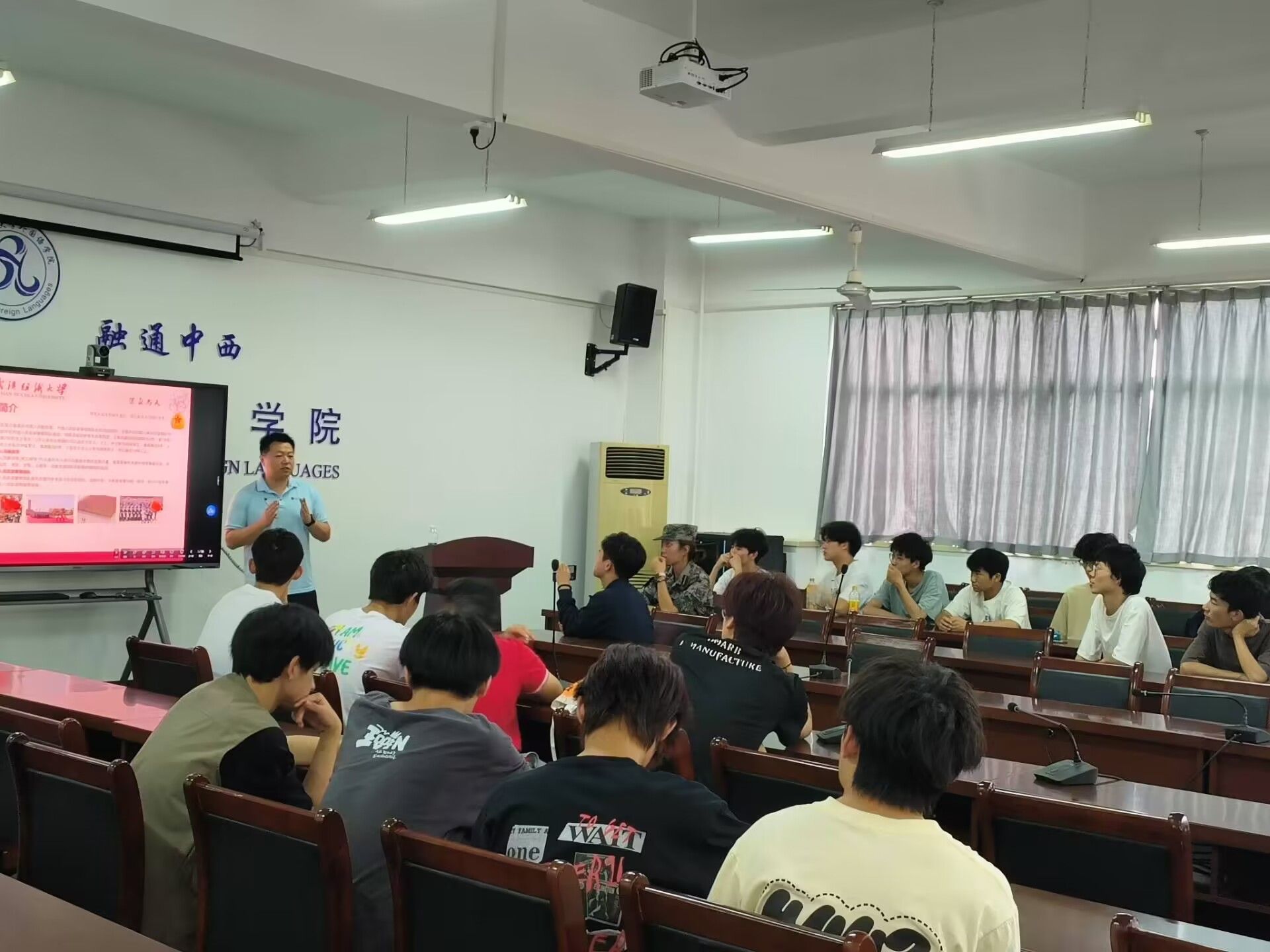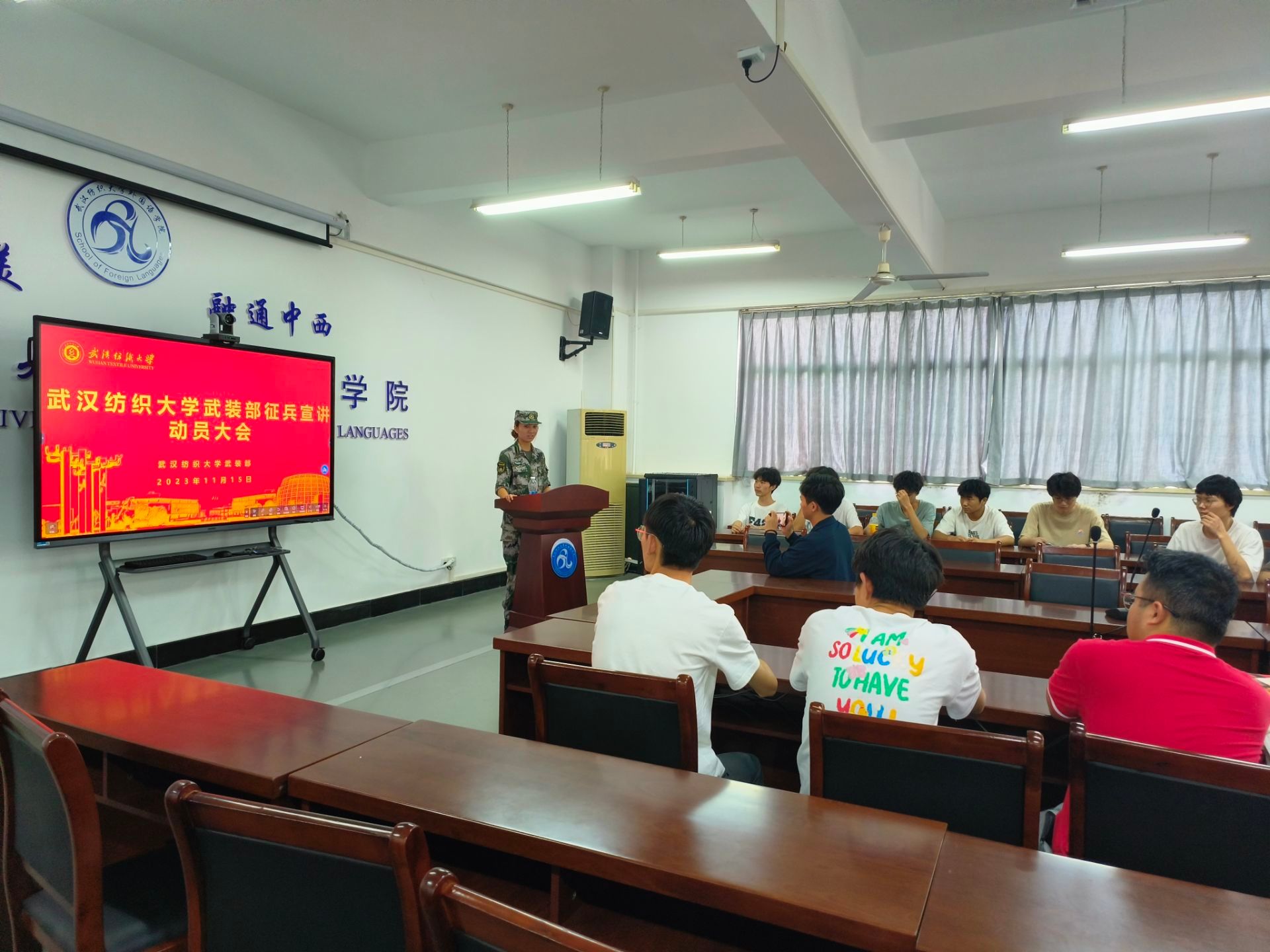 辅导员聂啸天详细介绍了武装部征兵政策以及对大学生服役的优待政策,解读征兵工作的重要意义和具体要求,说明各项参军知识与征兵指标,细致区分了各兵种特点,并且回答大家关心的问题。