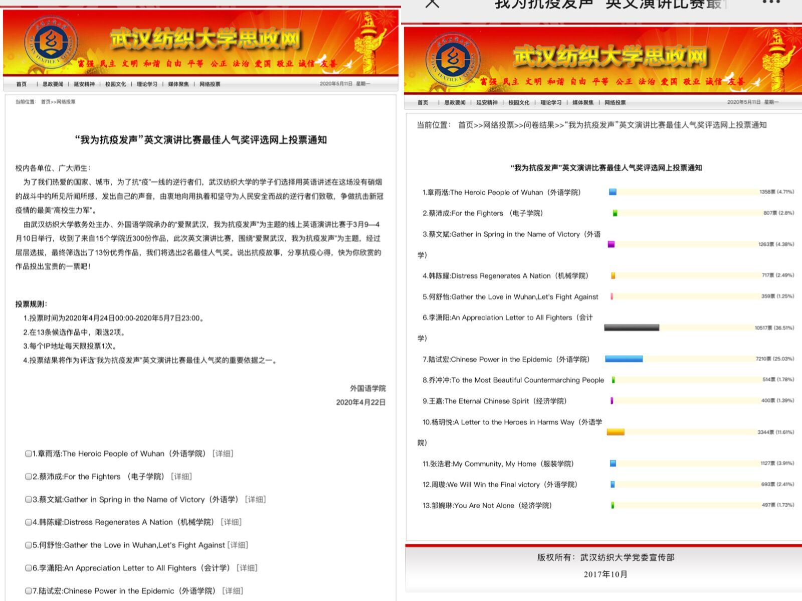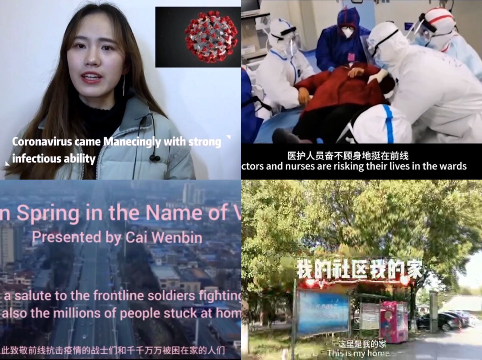 演讲比赛分为专业组和非专业组,经过前期同学们的精心准备和视频录制,收到了来自15个学院近300份作品。在众多的参赛作品中,同学们围绕抗击疫情的主题,歌颂着抗疫英雄们,分享疫情期间的感人事迹,表达对疫情的见解和看法,表明对战胜疫情的决心等。例如,WilliamHill中文蔡文斌的参赛作品“Gather in Spring in the Name of Victory”向奋战抗疫一线的战士们表达了崇敬感恩之情,向千千万万被困家中的人们传递了抗疫必胜的信心。经济学院邹婉琳的演讲“You are Not Alone”则表达了对医护工作者的感谢感激,对中国速度的赞叹。服装学院张浩君,在这场全民战役中,她勇敢的站了出来,加班加点保证爱心物资安全到岗,挨家挨户排查落实,上报情况,为社区居民的正常生活保驾护航。