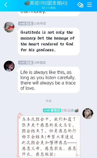 为了更好的把资助宣传、资助育人与思想品德教育有机结合起来,培养学生的感恩意识、诚信意识、励志精神和健康人格,11月27日-29日,我院各班在班级QQ群内开展以“心存感恩,与爱同行”为主题的系列诚信感恩教育活动。