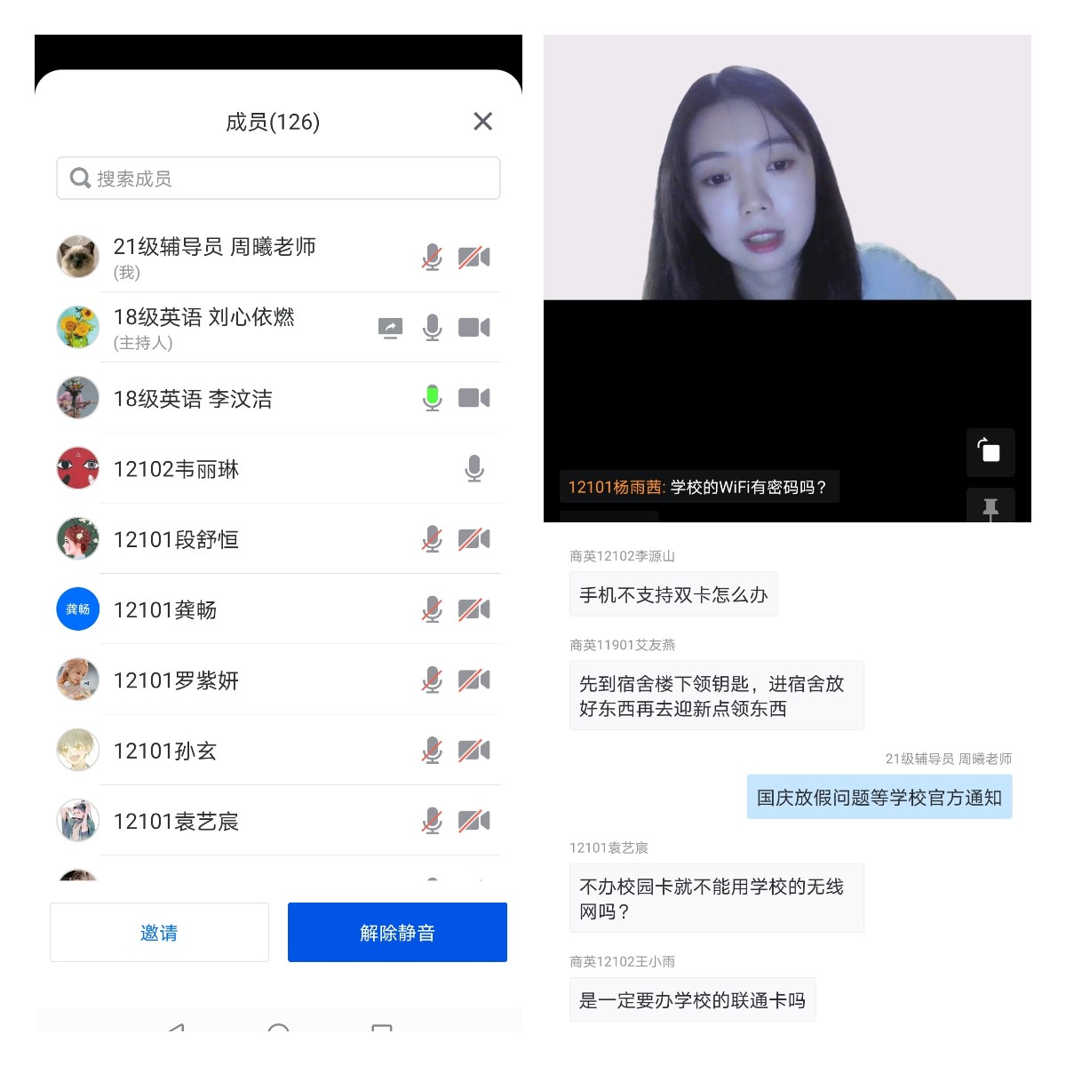 接下来,在刘心依燃同学的主持下,周曦老师、主持人以及班级助理为新生们答疑解惑。直播间气氛活跃,同学们纷纷发弹幕提问,周老师和学长学姐们耐心作答。周老师着重强调了近期网上迎新工作的紧迫性以及开学前的准备工作,刘心依燃同学针对同学们最关心的学习问题和宿舍问题作了较系统全面的科普,并传授了许多实用的校园生活经验,拉近了和新生之间的距离。