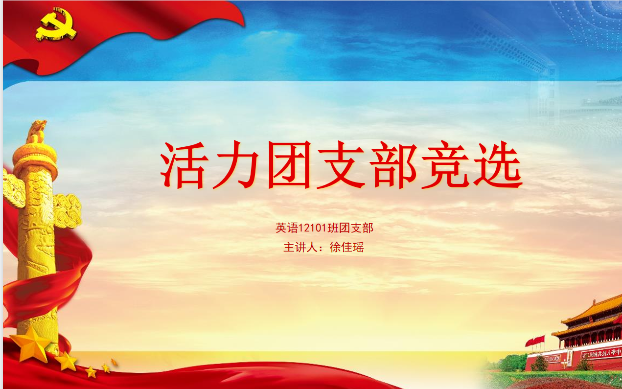 在活力团支部展示环节,英语12101团支部展示了班级党团活动完成情况、特色活动开展情况、成员风采展示三个部分详细介绍了班级的活动、风采,并且班级成员积极参与用中、英、法、日四国语言诵读《习近平谈治国理政》部分章节内容,班级同学交流发表感言,此次活力团支部不仅仅是一个展示的平台,更是一个学习交流沟通的平台。