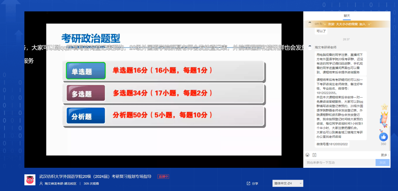 分享会上,导师根据数据和案例,就学校和专业选择、备考时间规划、复习书目推荐和心态调节等方面分享了策略建议。建议兴趣是最好的老师,专业和学校的选择需结合个人学习情况和研究兴趣,以及未来职业发展规划综合考虑,切忌好高骛远。此外,在备考复习阶段要结合院校推荐书目,科学合理安排复习时间和学习内容,有条不紊地进行公共课和专业课的学习。最后,提醒同学们,研路漫漫,同学们在拾级而上的过程中要保持良好心态,坚定目标信念,朝着心中的理想不断前进。在互动交流环节,双方就所关注的问题进行了提问和解答,气氛热烈。