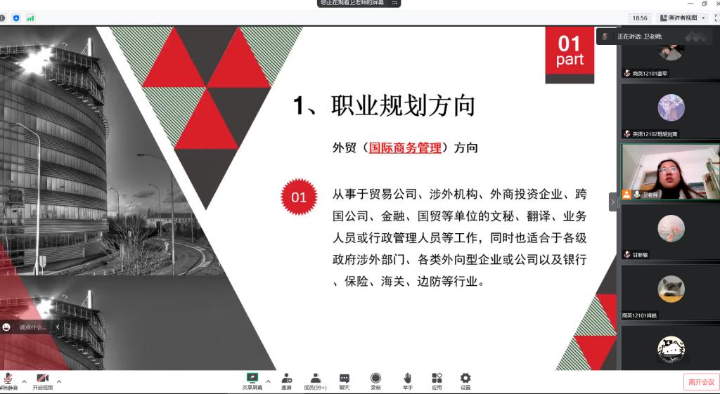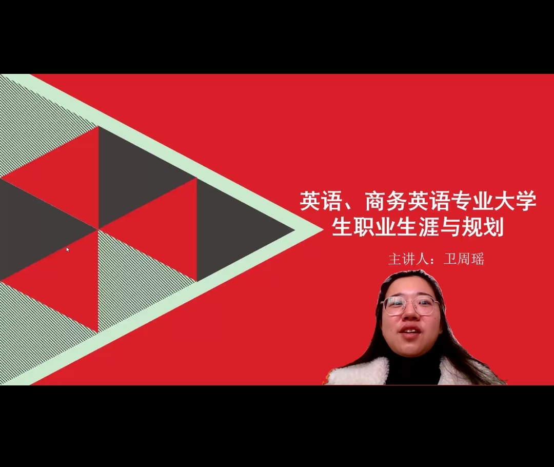 为了进一步增强同学们对外语专业就业前景的了解,提供更加全面的就业服务指导,11月20日于线上开展了2021级职业生涯规划课程第二课,此次课程主题为“英语、商务英语专业大学生职业生涯与规划”,课程由卫周瑶老师主讲,学院党委副书记彭阳慈航、辅导员甘新敏和全体2021级学生参与此次课程。