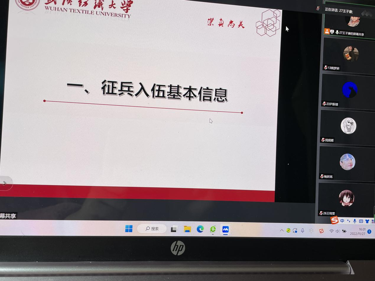 首先,老师先介绍了关于大学生征兵入伍的相关通知,包括部队简介、入伍条件、大学生参军特别优惠政策、军营生活等,并特别强调有参军意向的同学小心征兵诈骗。“参军将是改变参军的同学们人生的经历。”老师鼓励同学们,尤其是有意向参军的同学积极关注有关大学生参军入伍的有关信息,勇当强军重任,书写灿烂青春。