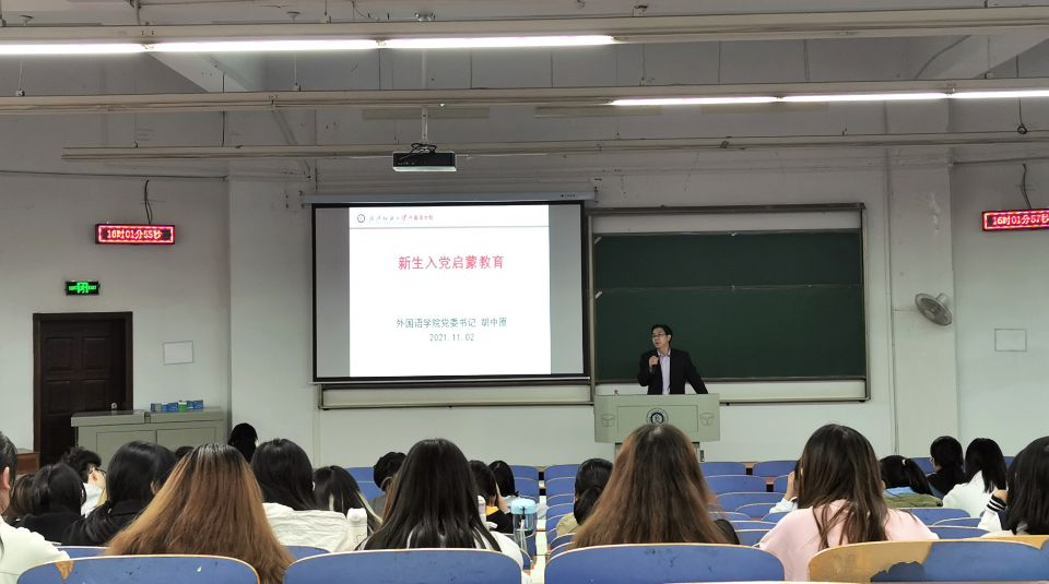 为了引导新生树立正确的入党动机,端正入党态度,树立远大志向,弘扬爱党爱国之志,11月12日,WilliamHill中文在阳光校区崇志楼T202开展2021级新生入党教育讲座,WilliamHill中文党委书记胡中原主讲,新生辅导员甘新敏和2022及全体新生参加讲座。