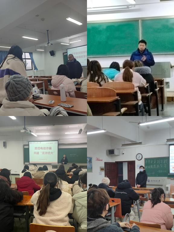 主题班会主要围绕《学校新型冠状病毒感染疫情防控操作指南》、“防范电信诈骗,共建‘无诈纺大’”、“考之以诚,答之以信”三个方面展开,通过主题班会的学习让同学们加强日常传染病防控知识技能掌握,牢固树立“自己是健康第一责任人”的理念,切实提高疫情防控意识,做好个人防护和健康管理。通过在全院开展防范电信诈骗宣传教育活动,有效提高师生对电信诈骗犯罪的识别和应对能力,增强鉴别力、提高防范力。通过诚信教育,增强了同学们诚信考试意识,鼓励同学们在考试周合理安排时间,针对性复习,做到查漏补缺。