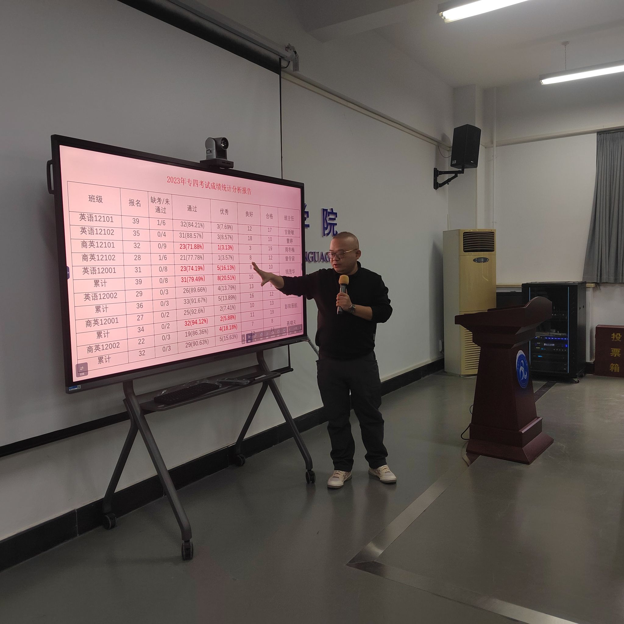 首先,年级辅导员对所带年级各班学风建设、班风考勤、专四通过率、获奖情况、六类重点困难学生进行了汇报,其中着重对低年级学业预警和毕业班考研就业去向进行了数据分析和问题通报。