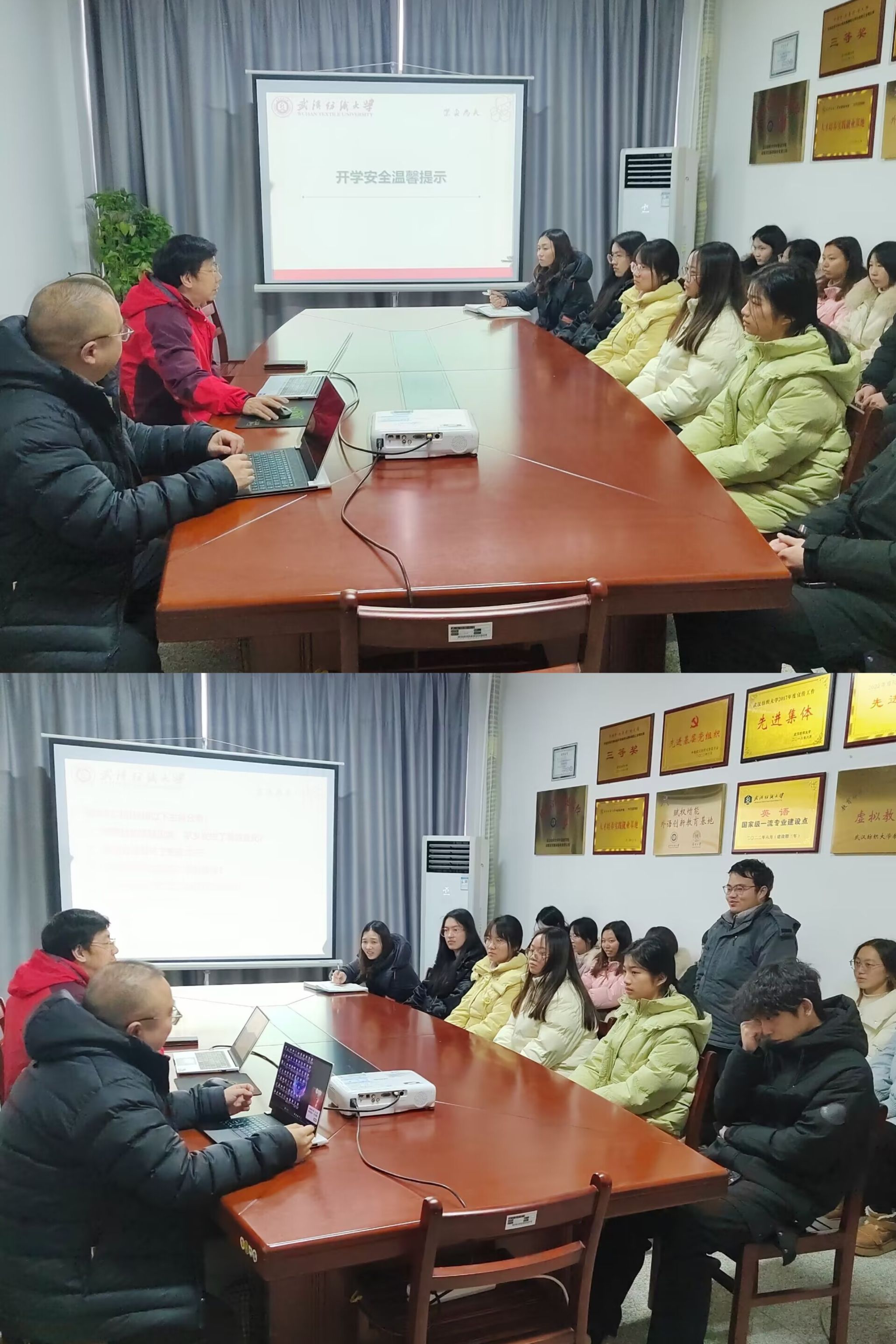 班会紧紧围绕新学期学业规划、校园安全、寒假社会见闻、心理调适等内容展开。会上,各班主任、辅导员首先传达了春季学期开学返校的相关工作安排,针对因事因病因交通暂缓返校学生,进行家校互联确认。对已返校学生,则了解学生思想及行为动态,掌握学生在校在宿情况,引导学生调整作息,调适心理状态,尽快投入新学期的学习生活;其次,班会开展人身财产安全、消防用电安全、网络舆情教育等多角度安全教育,强调安全稳定是一切工作有序进行的保障,要求学生筑牢个人安全防线,提高辨别能力,遇到问题及时与辅导员沟通,并组织学生集中签订《开学安全责任告知书》。