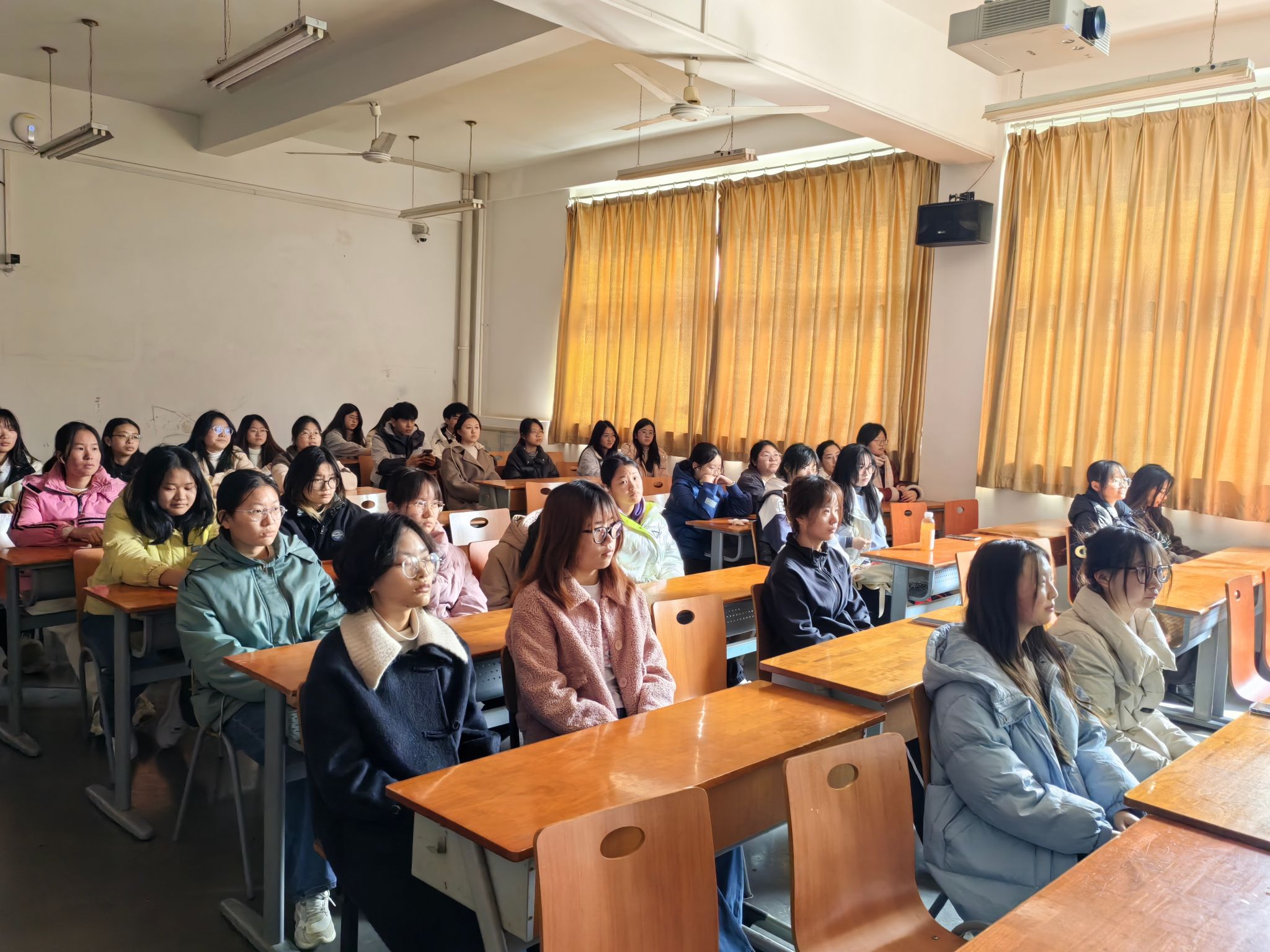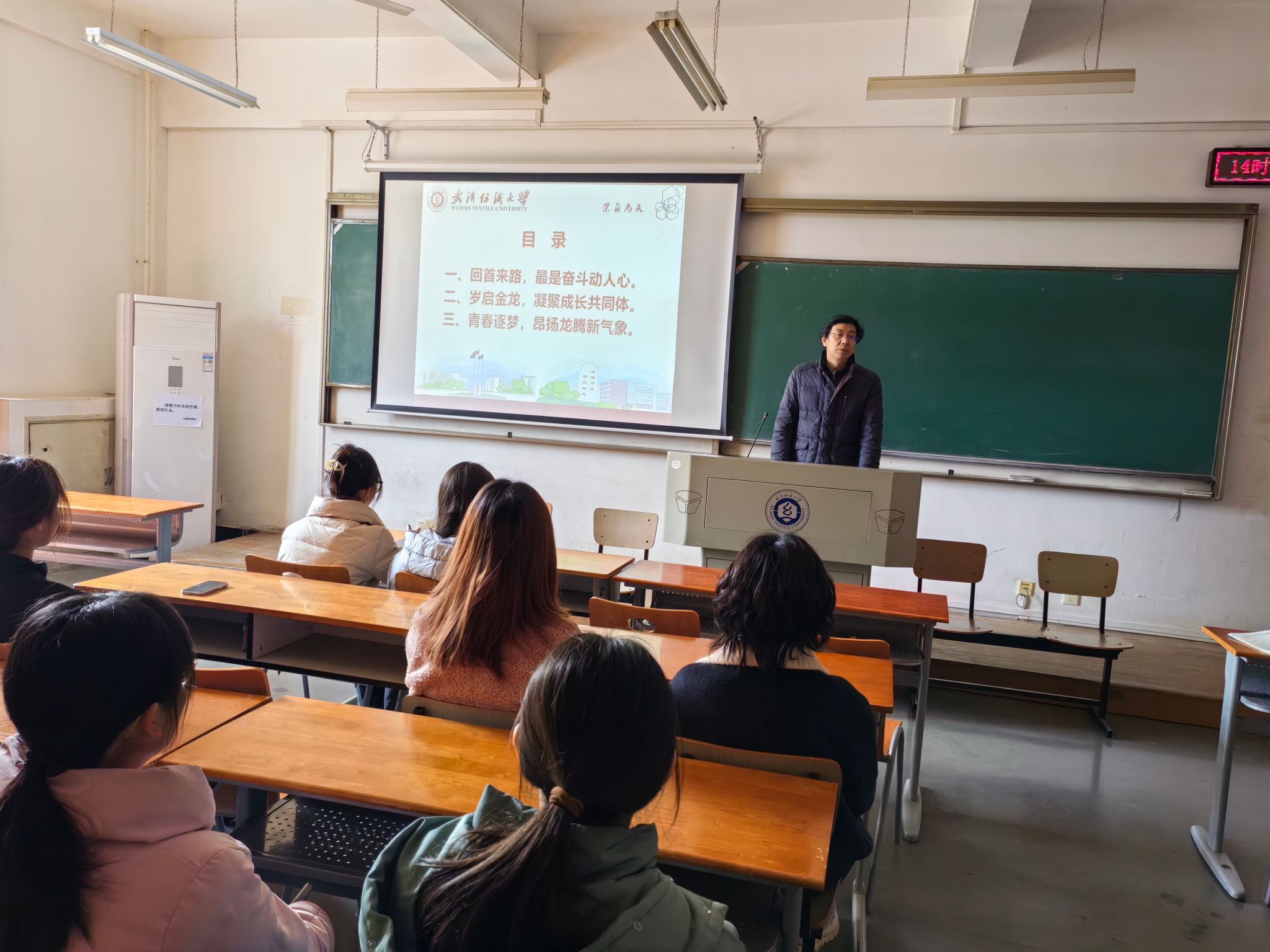 主题班会上,胡中原从“回首来路,最是奋斗动人心”,“岁启金龙,凝聚成长共同体”,“青春逐梦,昂扬龙腾新气象”三个方面向同学们提出了新学期新的要求。他强调,同学们要做一个有家国情怀的人,要关心国家大事,外院学子当明确人生理想,笃定前行方向,以徐卫林校长和年轻的航天科研人员为偶像,脚踏实地,坚定地走向自己的人生新阶段。他鼓励同学们走出寝室,拥抱自然,管理自我,充实生活,鼓励同学们学业要有干劲,人生要有规划,共同缔造“美好纺大”,成就精彩人生。