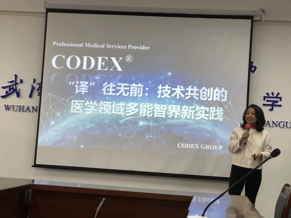 张晓星女士则围绕“译”往无前:技术共创的医学领域多能智界新实践展开分享。她以英汉医学词汇连线游戏开场,激发了同学们的兴趣。随后,张晓星介绍了自己从计算机专业跨界医学翻译领域并创立 CODEX 公司的经历,鼓励同学们选择热爱的方向以实现长远发展。她还阐述了技术与人相结合的共创模式,并列举家用生化分析仪未来应用及隐形牙齿矫正两个实例。最后,张晓星展示了 CODEX 公司以患者为中心的医学翻译服务,包括可视化工具、VR 与 AR 应用翻译以及跨学科协作团队培养成果。