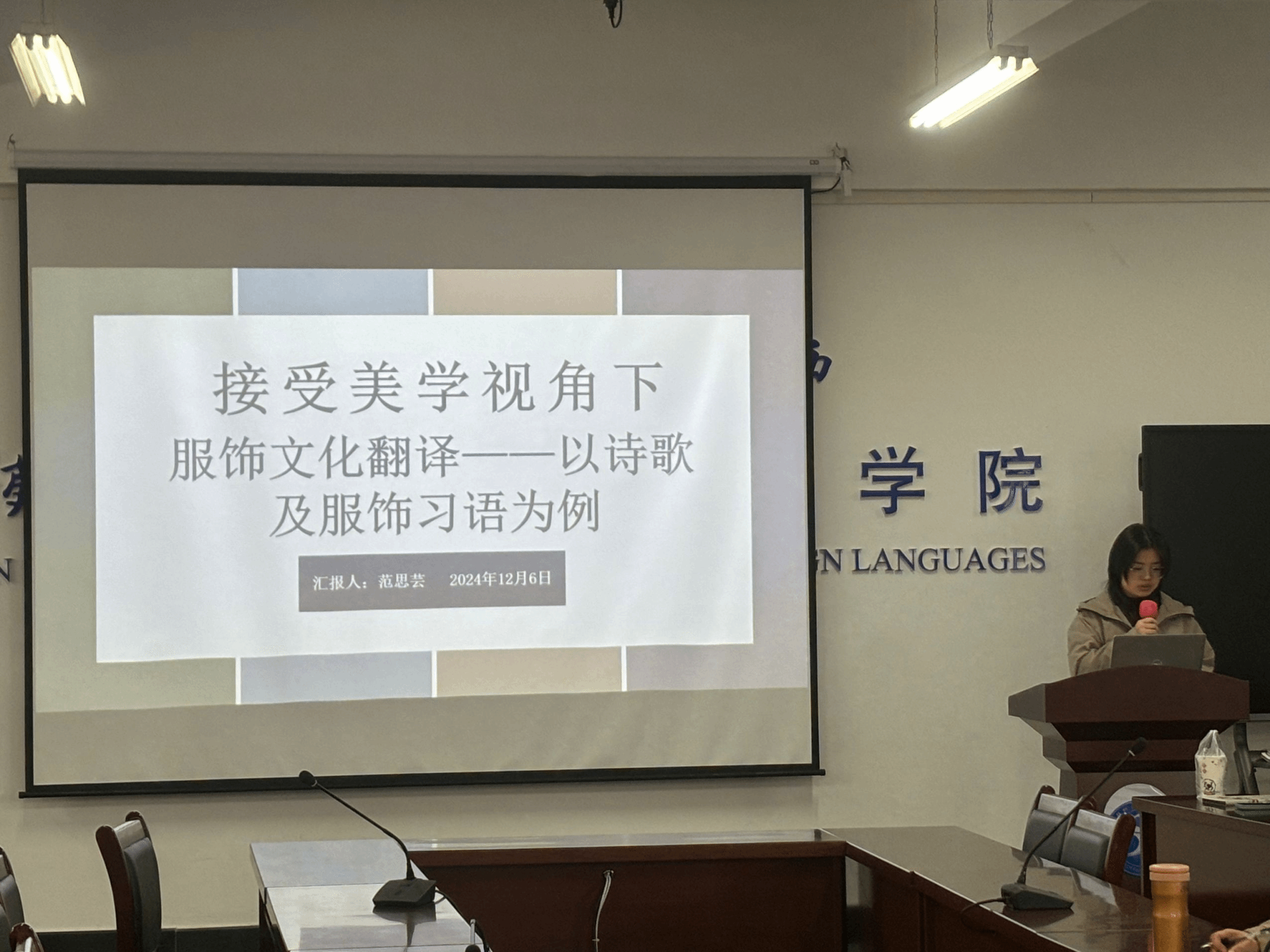 范思芸同学以“接受美学视角下服饰文化翻译——以诗歌及服饰习语为例”为主题,从接受美学理论角度提出了“读者期待视野”与“创设召唤结构”两大讨论方向,并运用《唐诗三百首》《汉语大词典》等文本,结合服饰翻译、习语翻译等相关例证,对理论的使用进行了深入的介绍,强调在翻译实践的过程中,我们必须注重源语境中的内涵,同时保留文风,让读者自觉填补翻译中的空白。