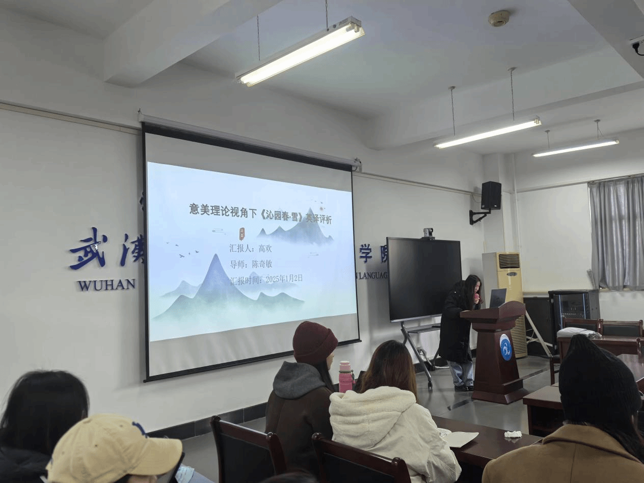 第一位汇报人高欢的主题为“意美理论下《沁园春·雪》英译评析”。她的报告分为四个部分,结构清晰。汇报人认为在文学翻译,尤其是诗词翻译领域,诗词的可译性经实践与研究得以证实。毛泽东诗词作为典范,融合浪漫与现实,反映新民主主义与社会主义建设历程,展现其文学才华。本文通过意美理论视角,以《沁园春·雪》为例,探讨国内外翻译家的方法与技巧,从修辞、意象、典故三方面评析,总结翻译风格差异,归纳诗词翻译方法,强调理解文化内涵、情感与意象,灵活运用意译、音译、直译等多种翻译策略,旨在促进中国文化的国际传播与中国精神的弘扬。