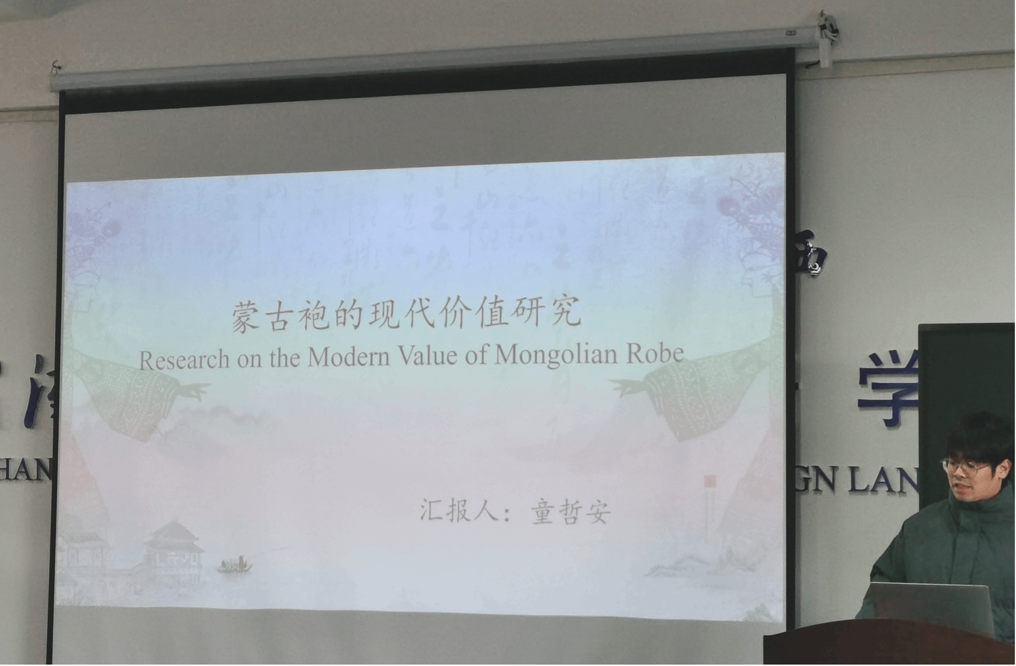 童哲安以《蒙古袍的现代价值研究》为题,从蒙古袍的发展演变、服饰特点、工艺特点等方面入手,深入挖掘了蒙古袍的设计价值和学术价值,并针对现存问题提出了思考,为蒙古袍在现代社会的传承与发展提供了宝贵的建议。