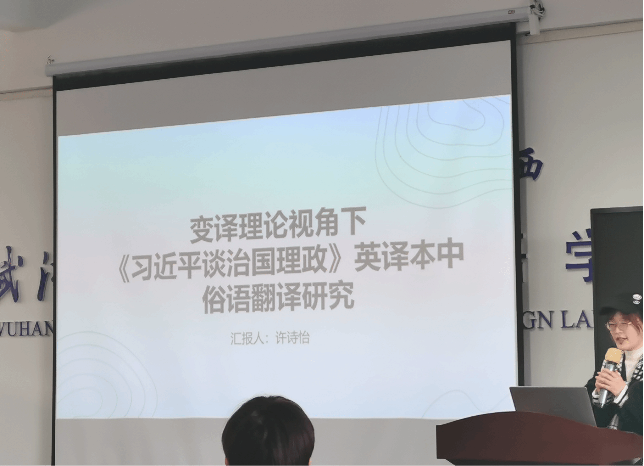 许诗怡以“变译理论视角下《习近平谈治国理政》英译本中俗语翻译研究”为主题,对《习近平谈治国理政》中俗语的翻译难点进行了剖析,并介绍了变译理论的发展历程和理论体系。许诗怡通过具体文本分析,展示了增、减、缩、并、编、述、改等变通手段在俗语翻译中的应用,强调了变译理论在提高外宣翻译可读性和交际性方面的重要性。