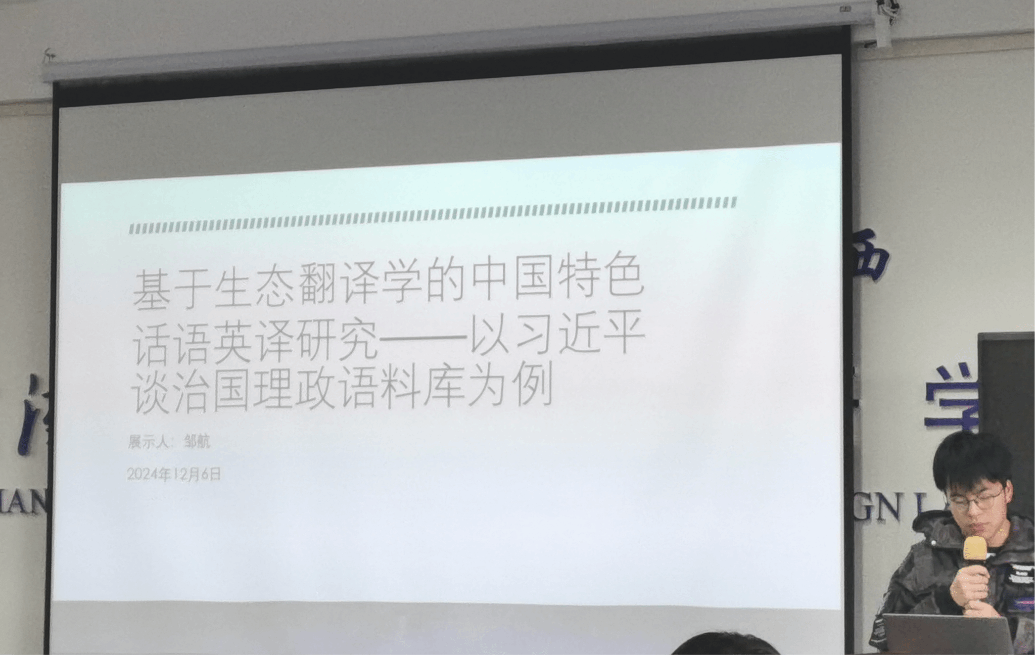 邹航以“基于生态翻译学的中国特色话语英译研究——以《习近平谈治国理政》语料库为例”为主题,从生态翻译学的“语言维”“文化维”“交际维”的三个维度,通过对《习近平谈治国理政》双语语料库中的中国特色词语的个人译本和官方译本进行对比分析,探讨了中国特色话语体系的特点及其在英译中的策略和技巧,为中国特色话语的对外传播提供了新的视角。